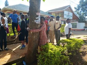 The chosen tree holds historical and symbolic significance for Cynthia. She traces its meaning back to Kenya’s freedom fighters. “This tree is called Mukuyu. I am holding onto it because, as we learned about the Mau Mau, Dedan Kimathi, and Jomo Kenyatta, they were freedom fighters against British colonialism. They fought for the country, and I also want to fight for our country. For Gen Z, because things are not going well where we are right now.”
