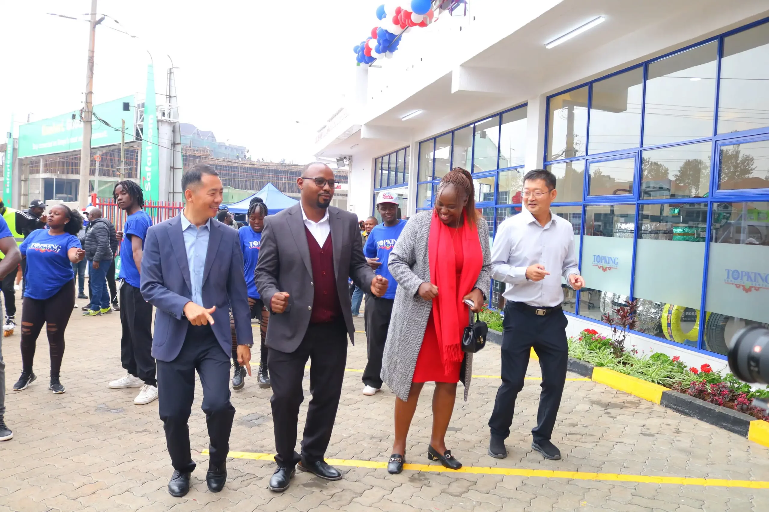 TopKing MD Francis Kamau(2nd left ) with KIA diirector Florence Wangui participate in a Jig with Investors Jack Wang and Hu Xiaojie during the official launch along Kiambu road